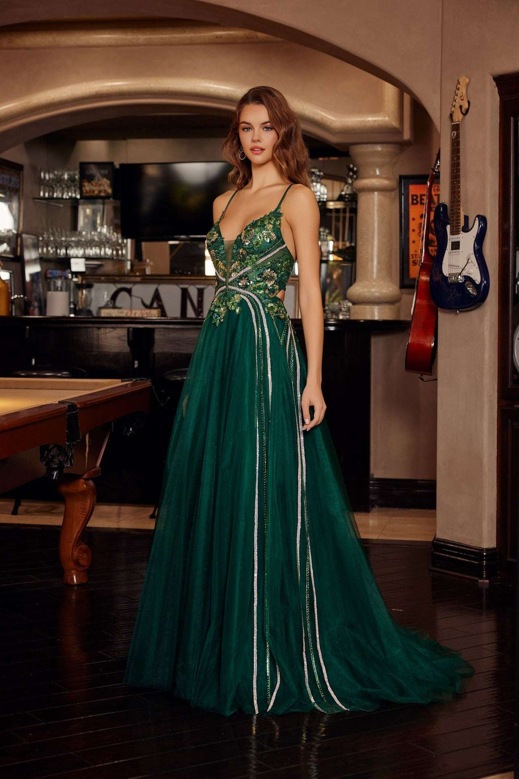 N G1795 - Layered Tulle A-Line Prom Gown with Sheer Bead Embroidered Bodice & Open Lace Up Back